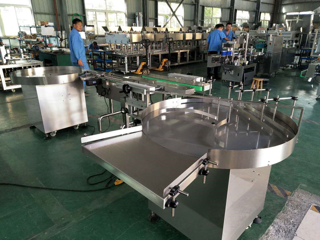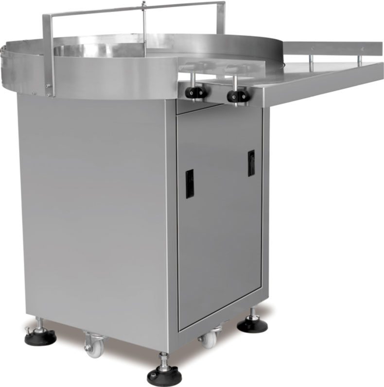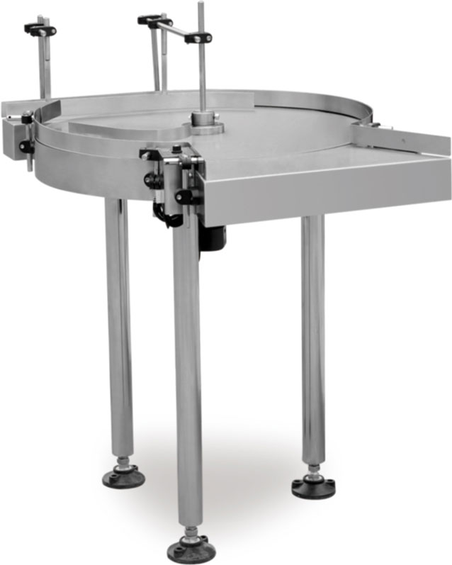 TTurntables are used to deliver bottles or other containers to tablet counters, fillers and to other points in the filling and packaging process. By adjusting the speed of the turntable rotation, the feeding rate of the empty bottles in the packaging process is carefully regulated.